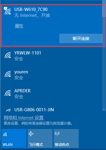 1、電腦打開無線網絡連接,搜索網絡,如下圖的“USR-W610_xxxx”(xxxx 是 MAC 地址后四位)即是模塊的默認網絡名稱(SSID)。電腦關閉防火墻與殺毒軟件并禁用除了wifi之外其他的網卡。