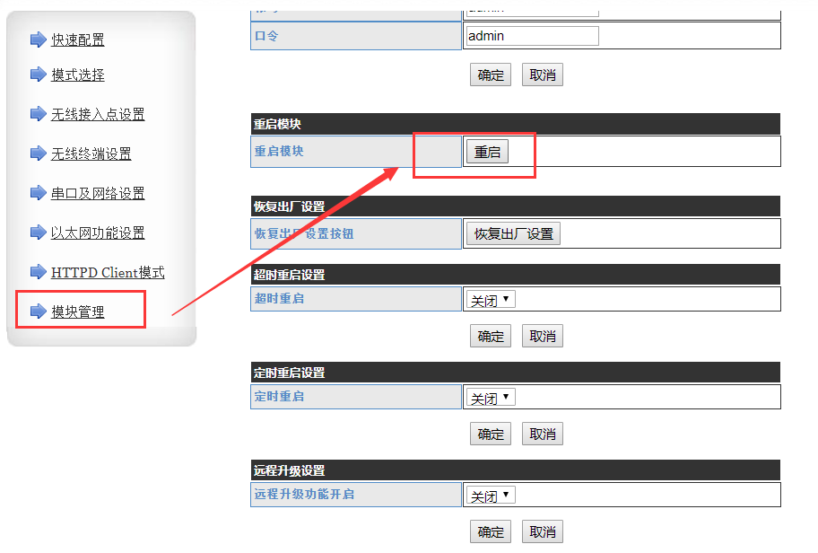 2、電腦瀏覽器地址欄輸入模塊默認IP:10.10.100.254,賬號和密碼都是admin,進入內置網頁,模式選擇 -> 數據傳輸模式 -> 串口指令模式,點擊確定,串口及網絡設置 -> 網絡參數設置 -> 網絡模式配置為client,點擊確定,重啟模塊。