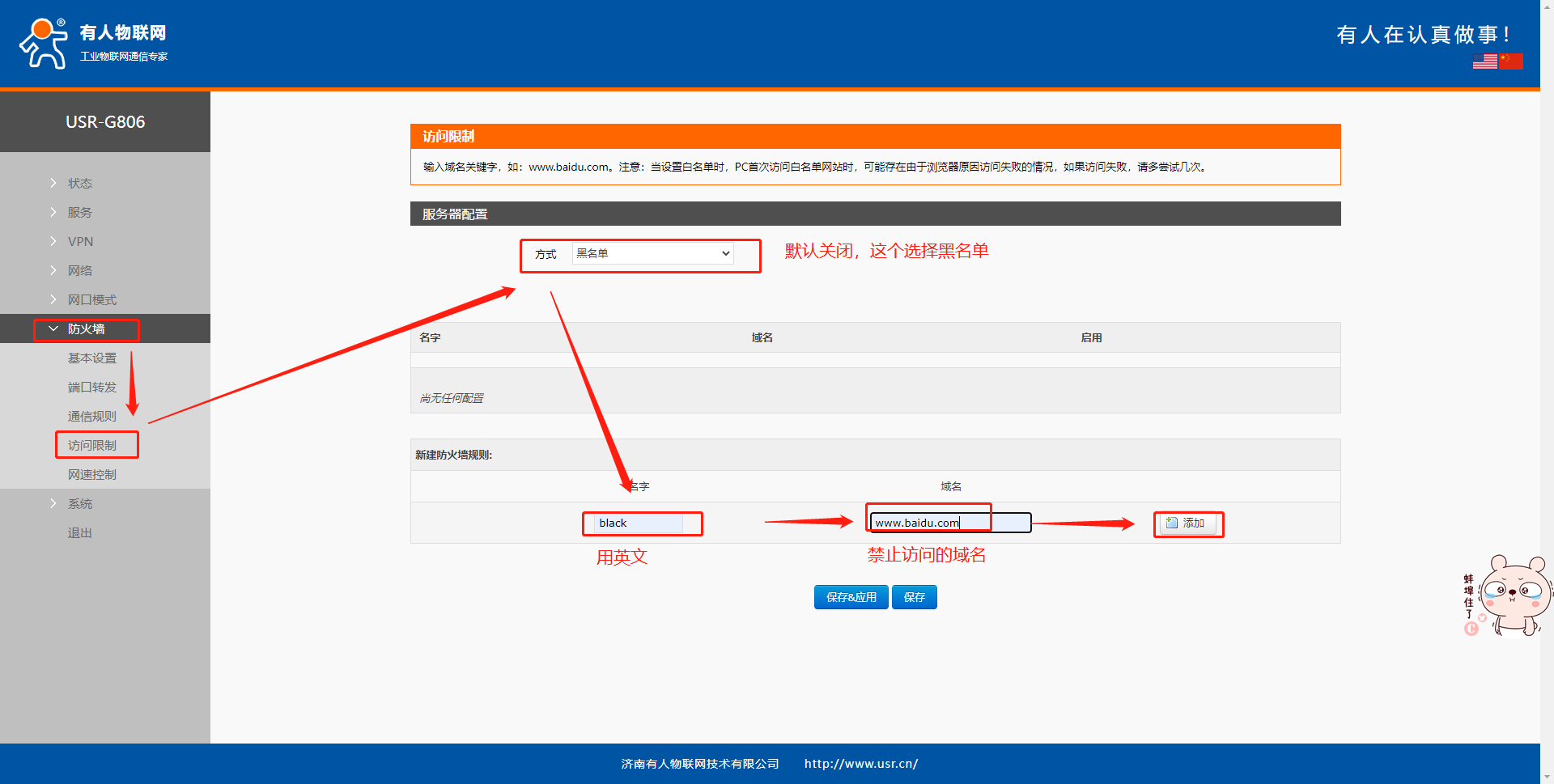 功能解釋:連接路由器的設備無法訪問黑名單的域名,其它域名地址可以正常訪問
