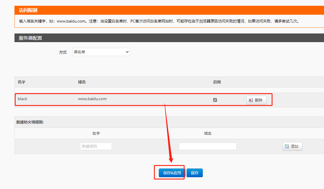 2>設置域名黑名單,注意:最后一定要“保存&應用”,參數才會生效