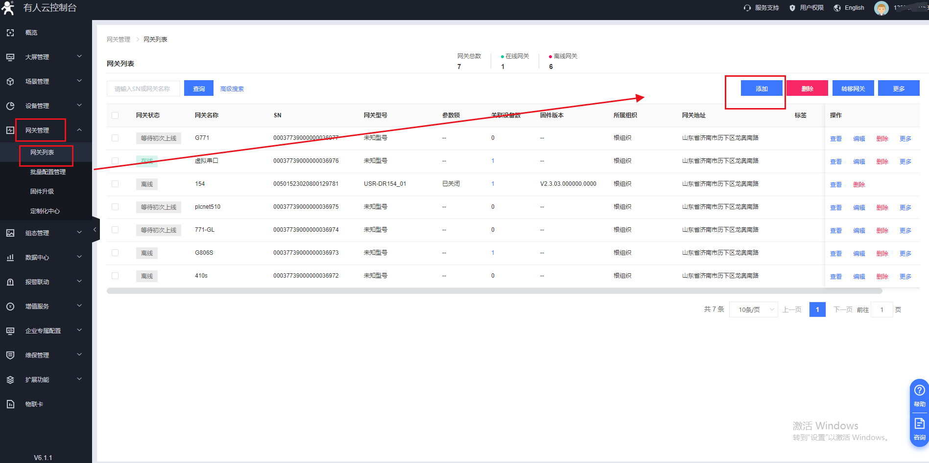 (1)云平臺添加網關,在網關管理---網關列表--添加,點擊SN不支持,系統自動生成,不需要客戶自己設置,通訊密碼可以自定義8位密碼.(建議使用系統自動生成的通訊密碼),開啟有人云透傳