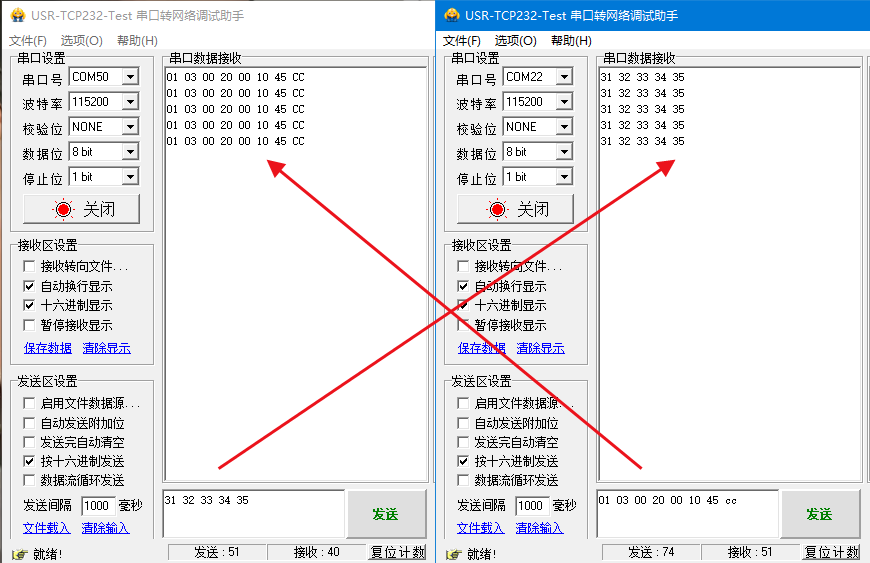 用串口調試助手分別打開806s用485轉usb接電腦上,識別的com口和虛擬串口com22,互發數據