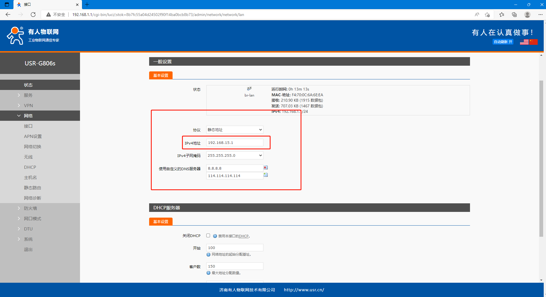5. 待設備重啟成功后,重新查看電腦獲取的IP,變成192.168.15.249,網關為192.168.15.1,瀏覽器輸入192.168.15.1進入配置網頁。