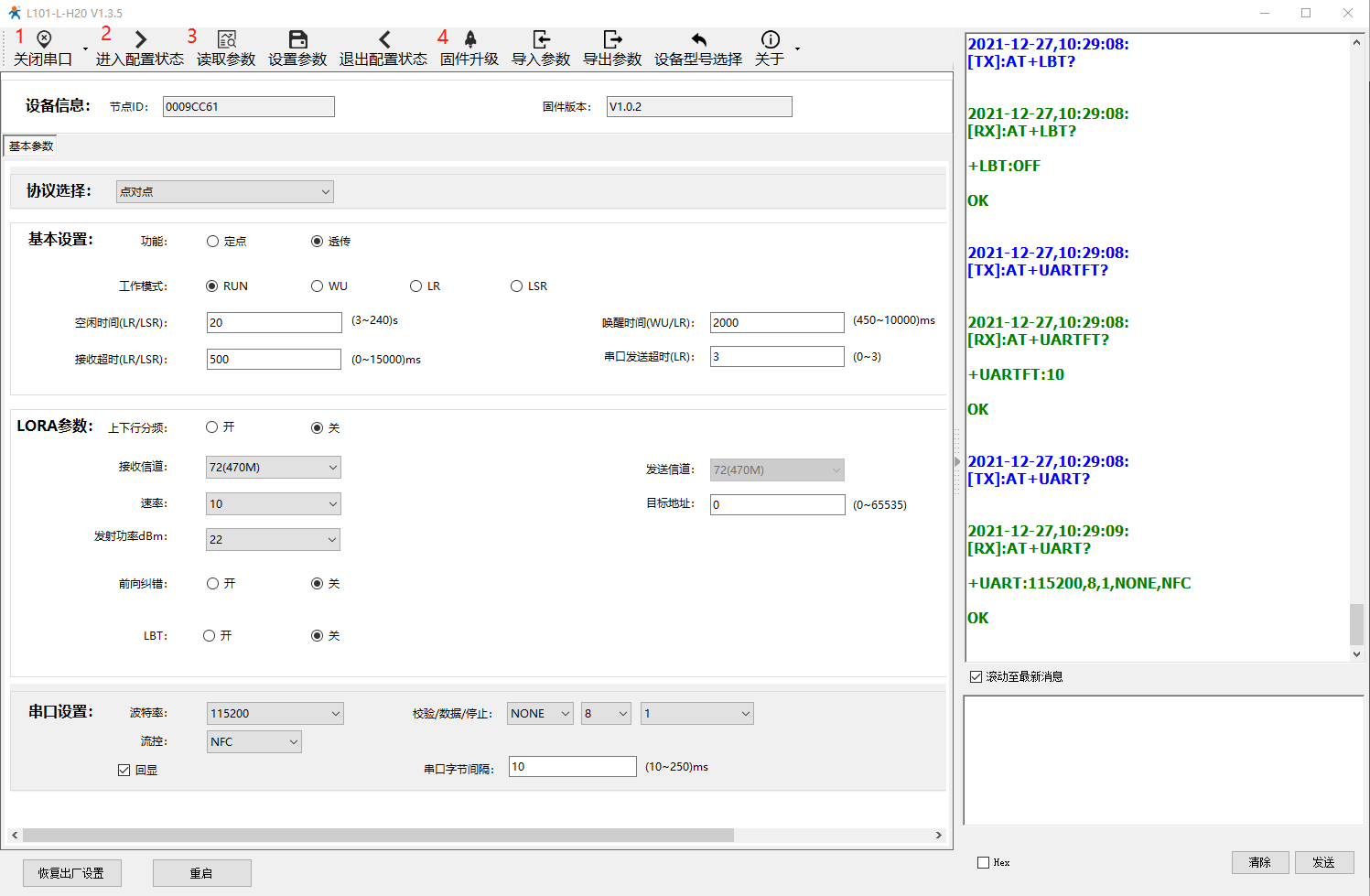 2、上電第一次,默認串口參數波特率115200、無數據位、數據位8、停止位1,打開對應101的COM口, 點擊“進入配置狀態”返回+ok后點擊“讀取參數”。