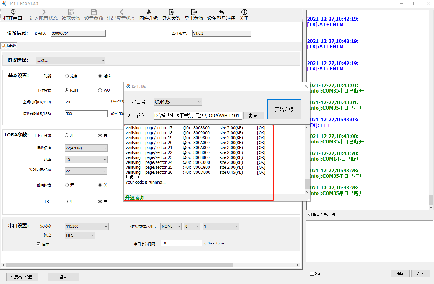 3、參數讀完點擊“固件升級”,選擇對應COM串口,選擇固件路徑后直接給101-L斷電,按住“Reload”鍵不放(Reload管腳電平狀態持續拉低),給101設備上電,點擊“開始升級”。