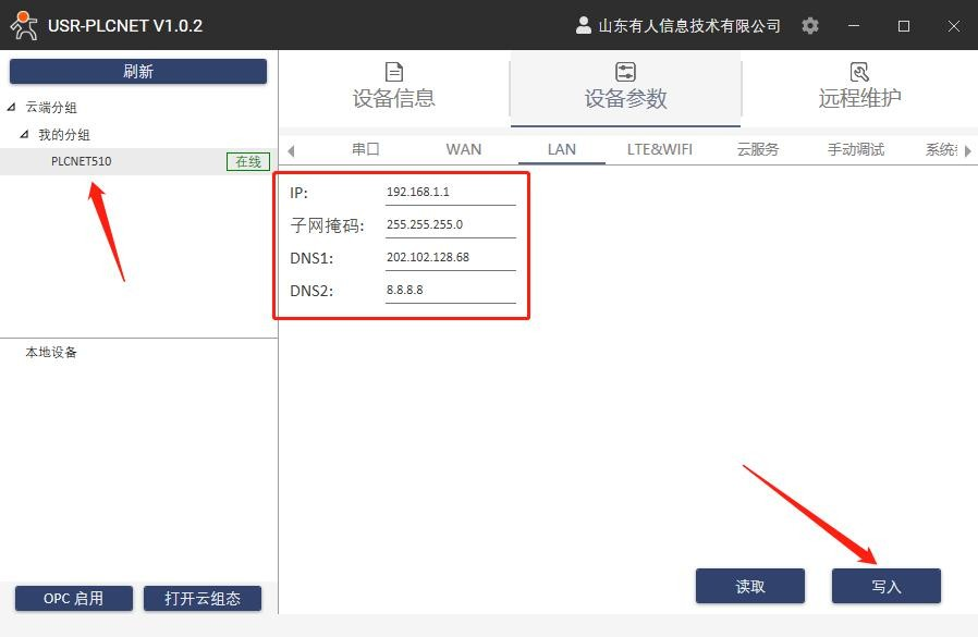10.選中在線設(shè)備,設(shè)備參數(shù)->LAN,修改 LAN 口 IP 和 PLC 的網(wǎng)口 IP 在同一網(wǎng)段,點擊寫入