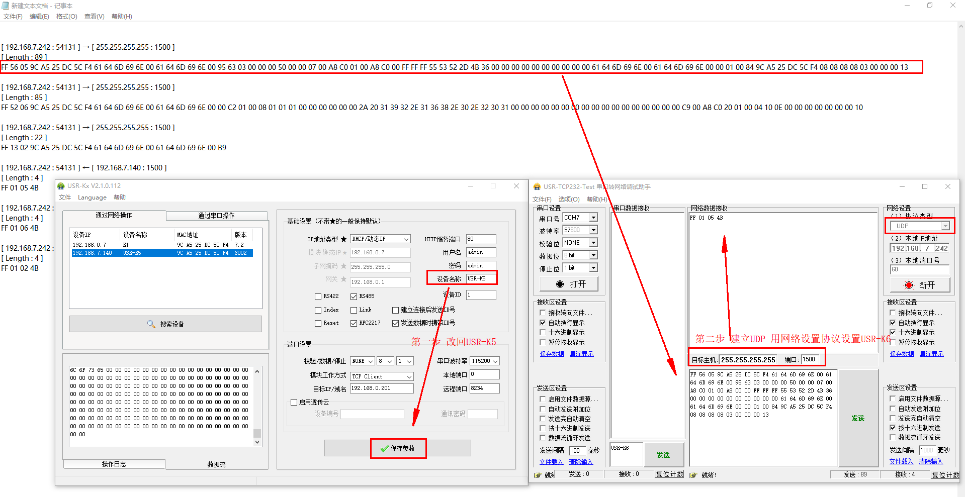 二、USR-K5使用USR-Kx軟件,點擊保存參數,數據流可以查看對應的網絡協議。