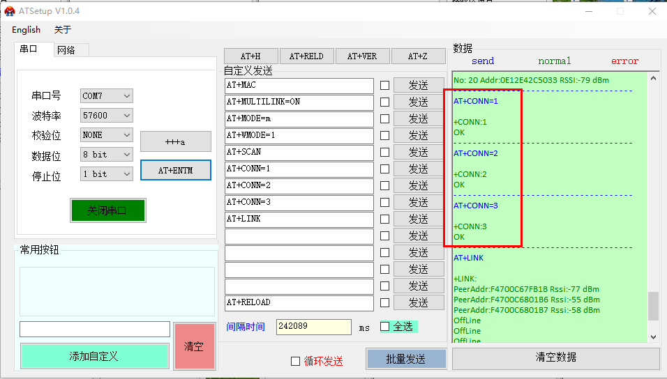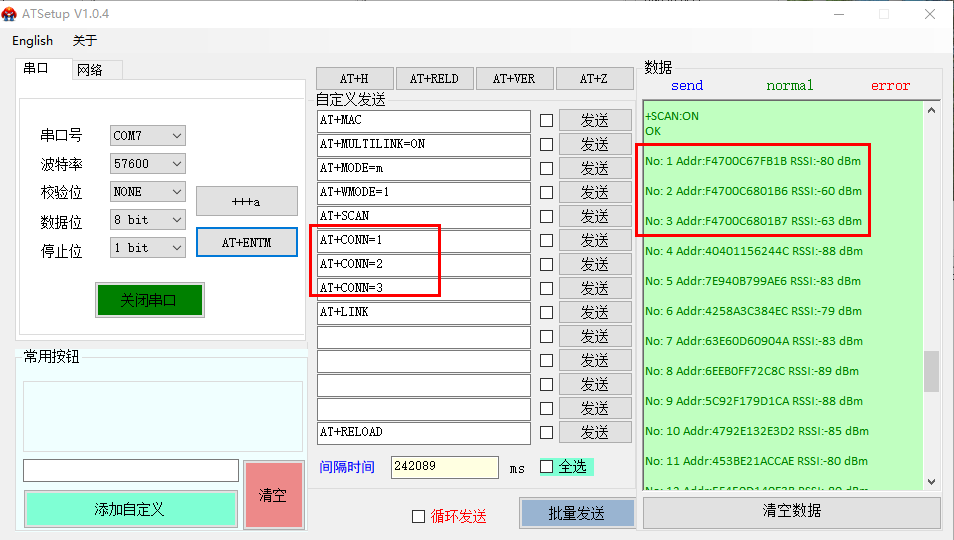 (3)根據(jù)掃描結果進行連接,依次發(fā)送AT+CONN=1、AT+CONN=2、AT+CONN=3,連接3個從機