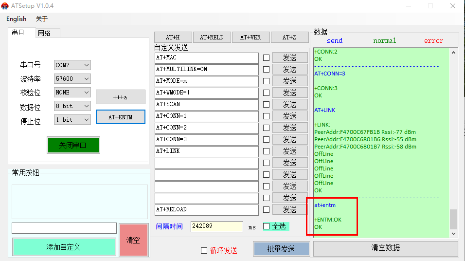 (5)查詢連接成功后,發(fā)送指令退出 AT 模式即可進行數(shù)據(jù)傳輸: AT+ENTM