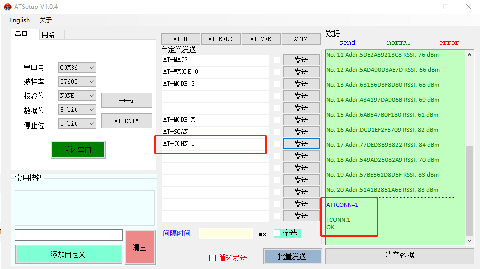 AT+CONN=MAC(MAC為從設備模式MAC地址,從設備模式可通過AT+MAC查詢)