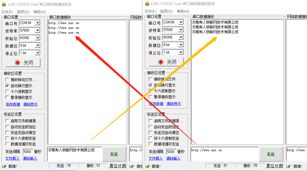 關閉AT指令設置軟件的串口后打開串口測試軟件,可以進行數據透傳通信測試。