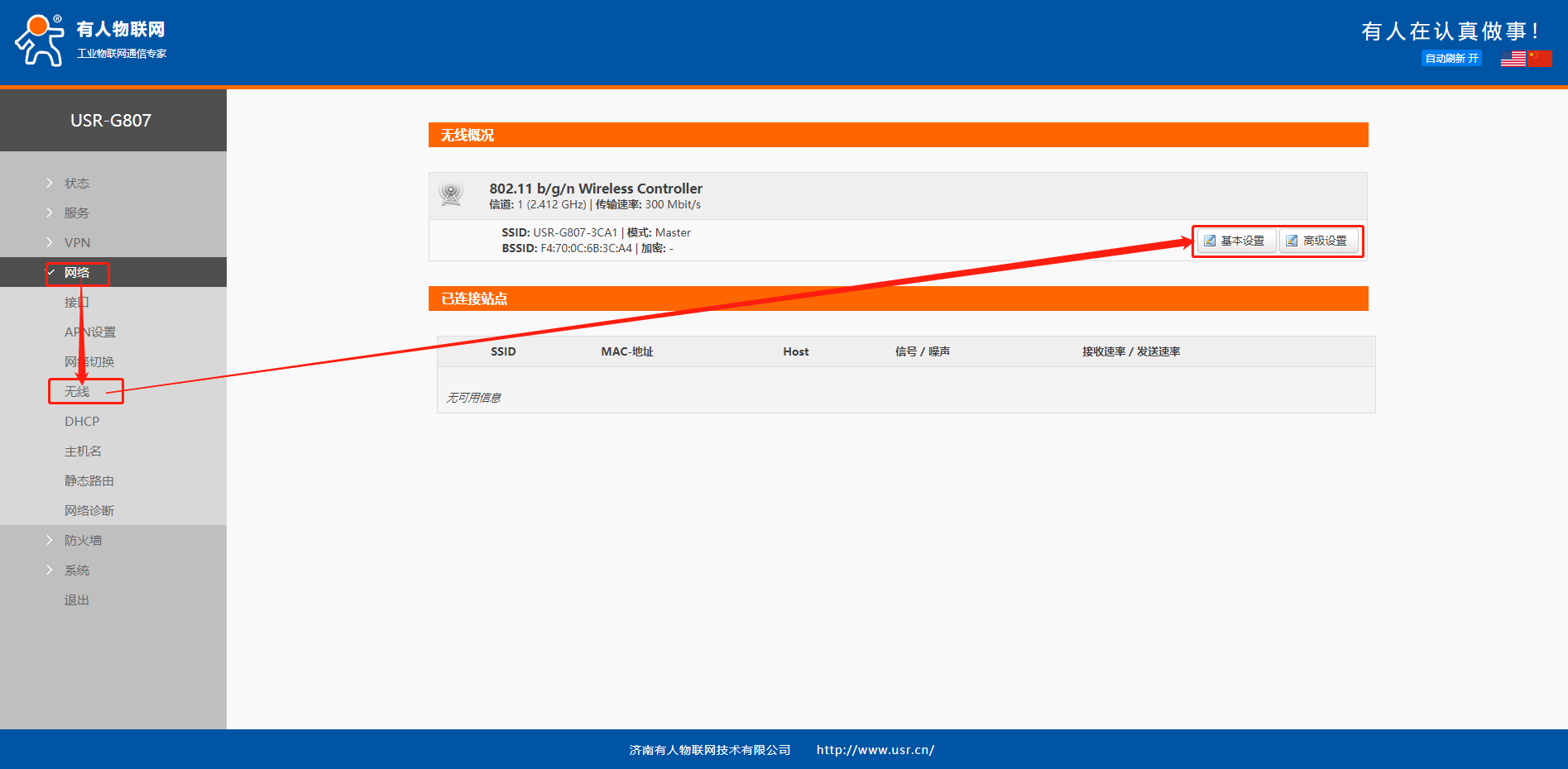3、進入網(wǎng)絡--無線界面,點擊無線概況中的基本設(shè)置或高級設(shè)置按鈕,進入wifi的參數(shù)修改界面
