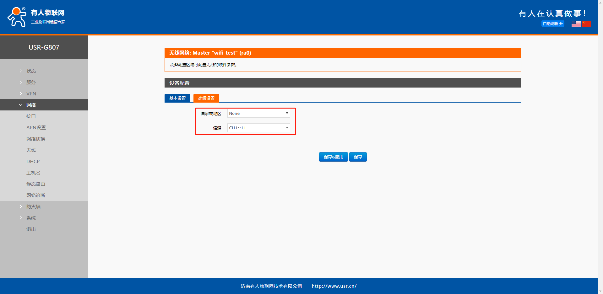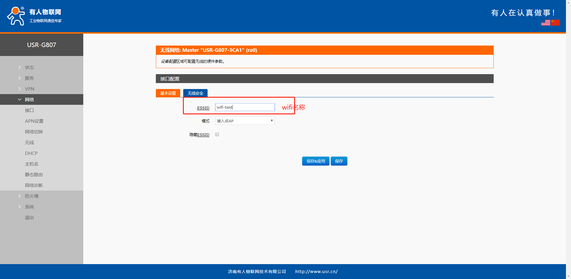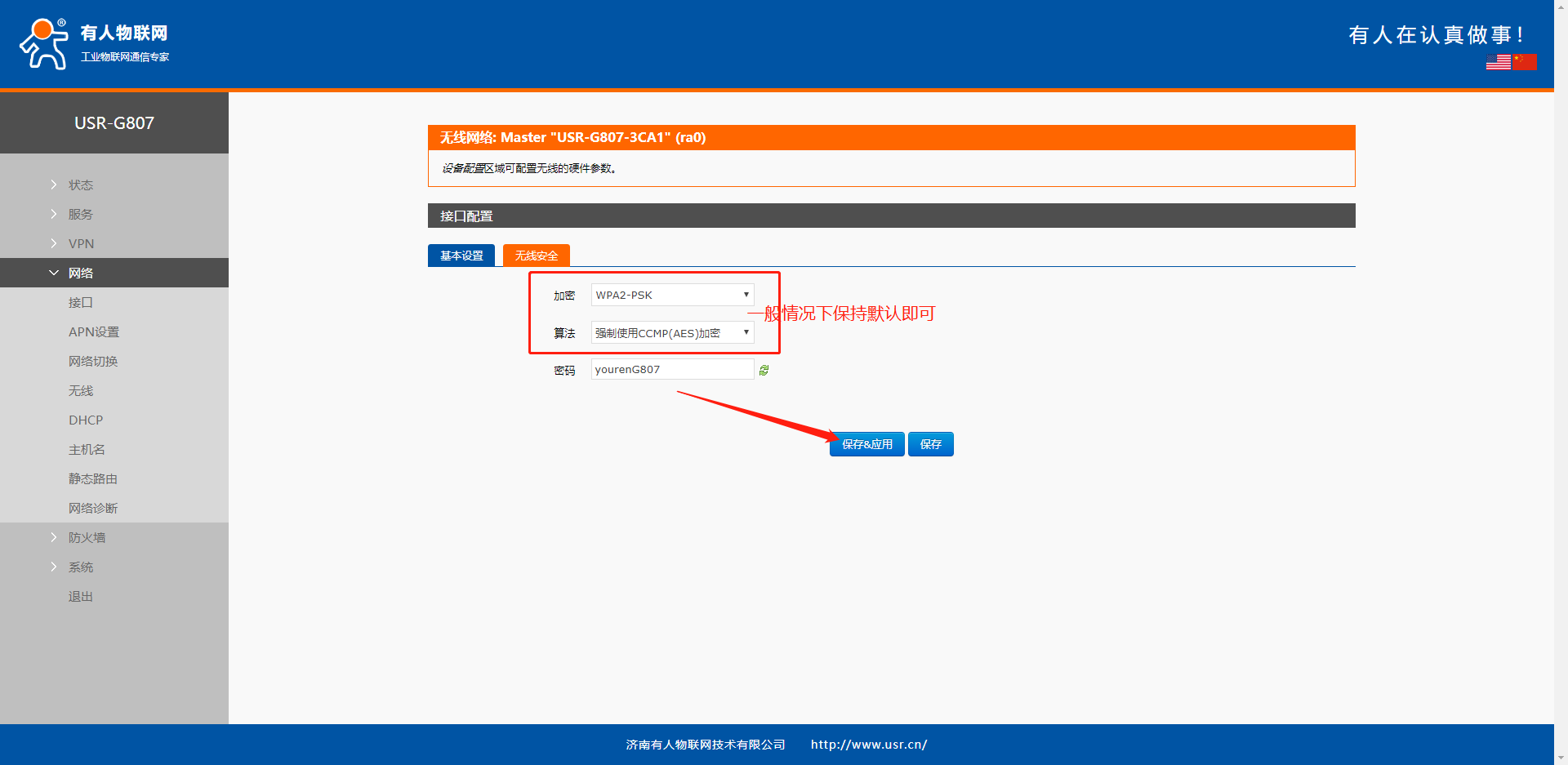 5、接口配置---無線安全界面,可修改加密、算法方式和wifi密碼(加密和算法若無特殊要求,保持默認即可)。這里將wifi密碼改為yourenG807,修改完成后保存應用