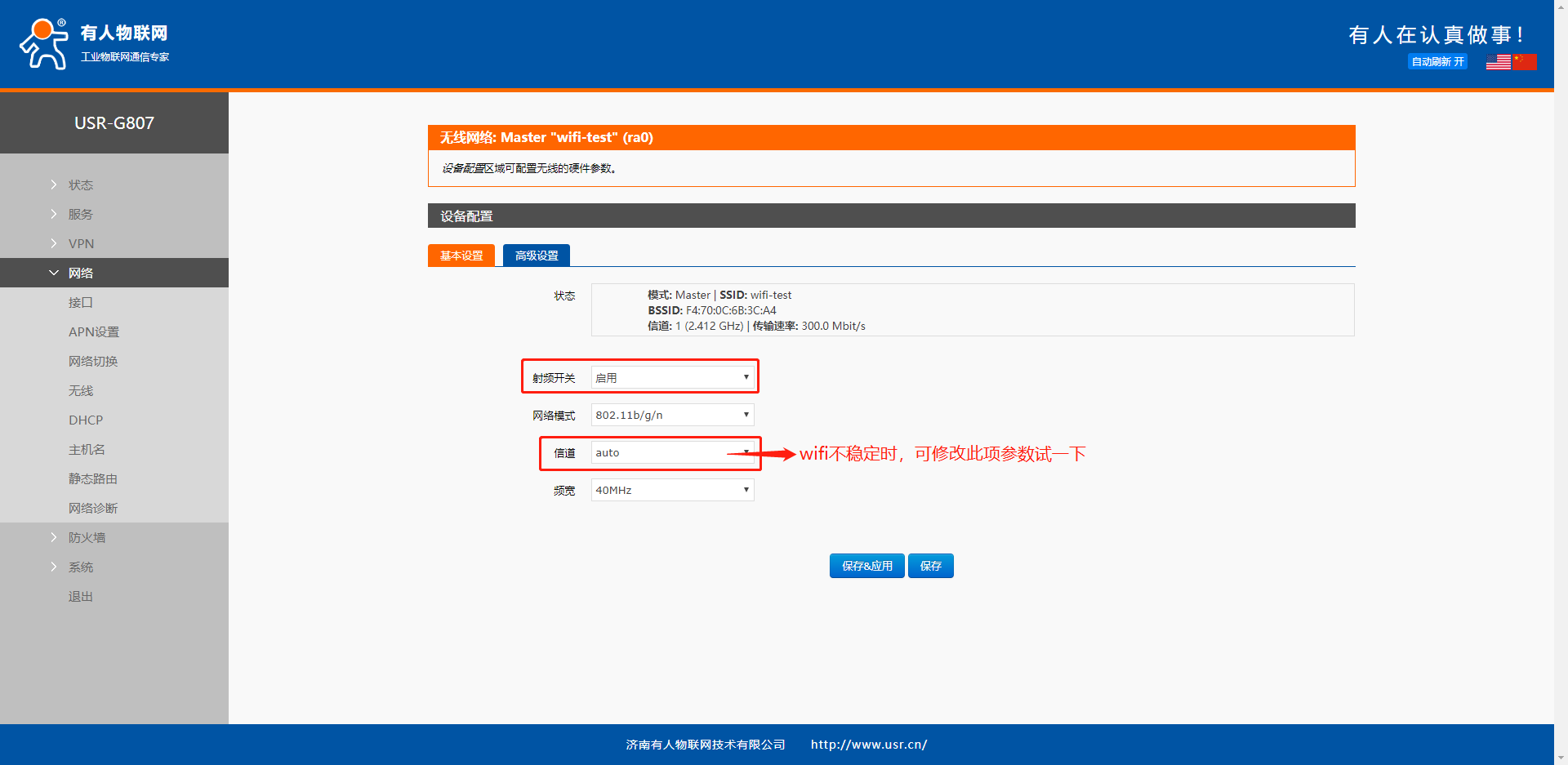 6、設(shè)備配置--基本設(shè)置界面,可將wifi射頻開關(guān)啟用或關(guān)閉,若啟用則wifi射頻打開,AP 可使用;若禁用wifi射頻關(guān)閉,AP不可使用,wifi指示燈滅。網(wǎng)絡模式和頻寬正常也保持默認即可,信道默認auto,如果現(xiàn)場AP信號較多,容易產(chǎn)生干擾,可以在此選擇一條干凈的信道(也就是連接數(shù)量較少的信道)