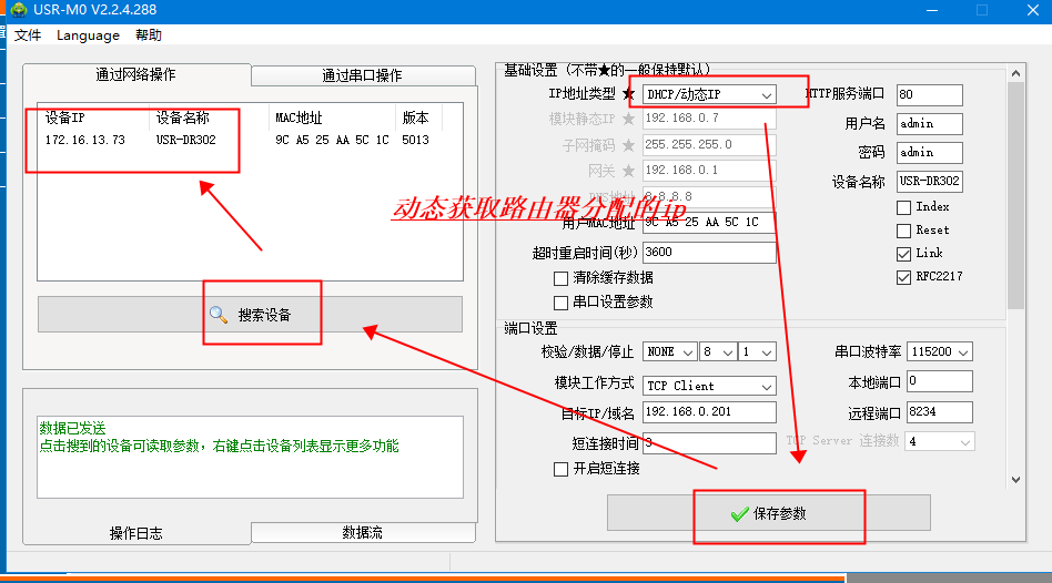 4. 修改成動態獲取(DHCP/動態ip),保存參數——重新搜索。然后可以看到路由器分配給DR302的動態ip,打開瀏覽器輸入路由器分配的ip進內置網頁,用戶名和密碼都是admin