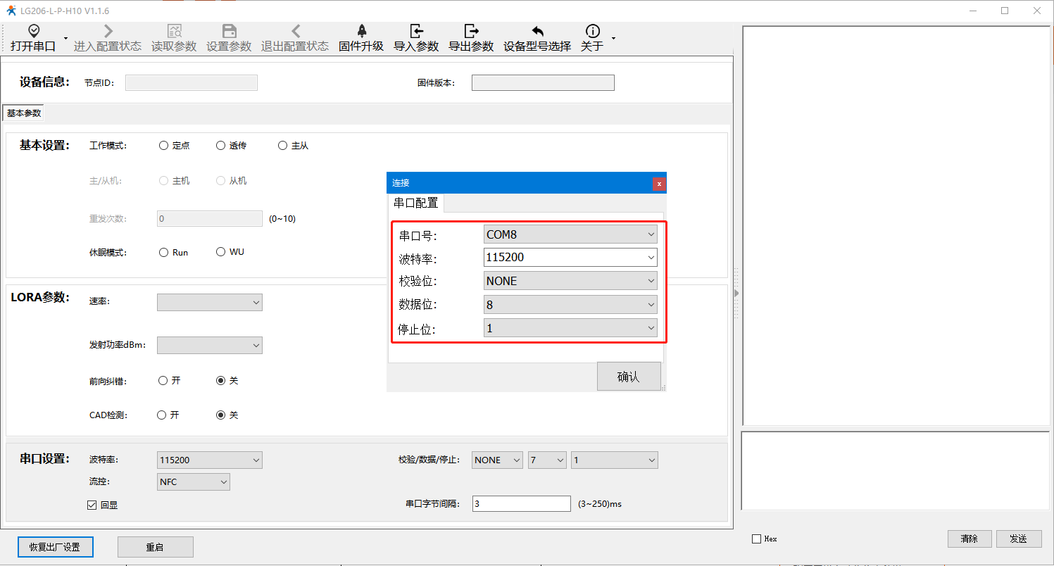 2>LG206出廠默認串口參數是115200,N,8,1的串口參數,如果修改過串口參數的話,用選擇修改后的參數;如果忘記了串口參數,就將LG206硬件恢復出廠設置