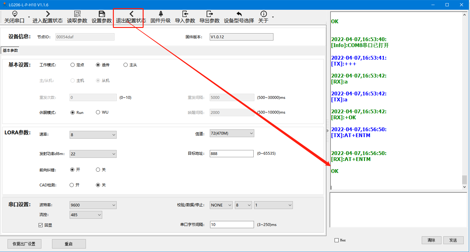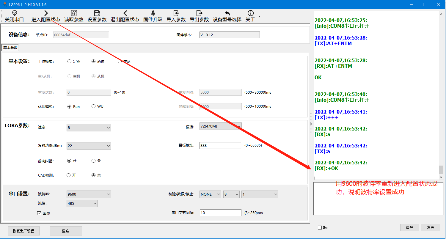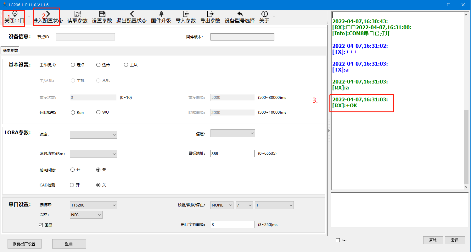 5. 進入配置狀態:打開串口---進入配置狀態,收到+ok說明進入配置狀態成功,否則失敗。進入配置狀態失敗,則無法正常進行參數配置了。