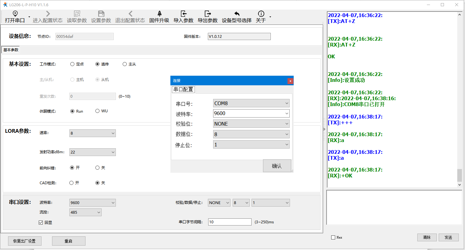 LG206-L-P-H10的串口通過USB轉232/485接到電腦上,接上lora天線,上電。