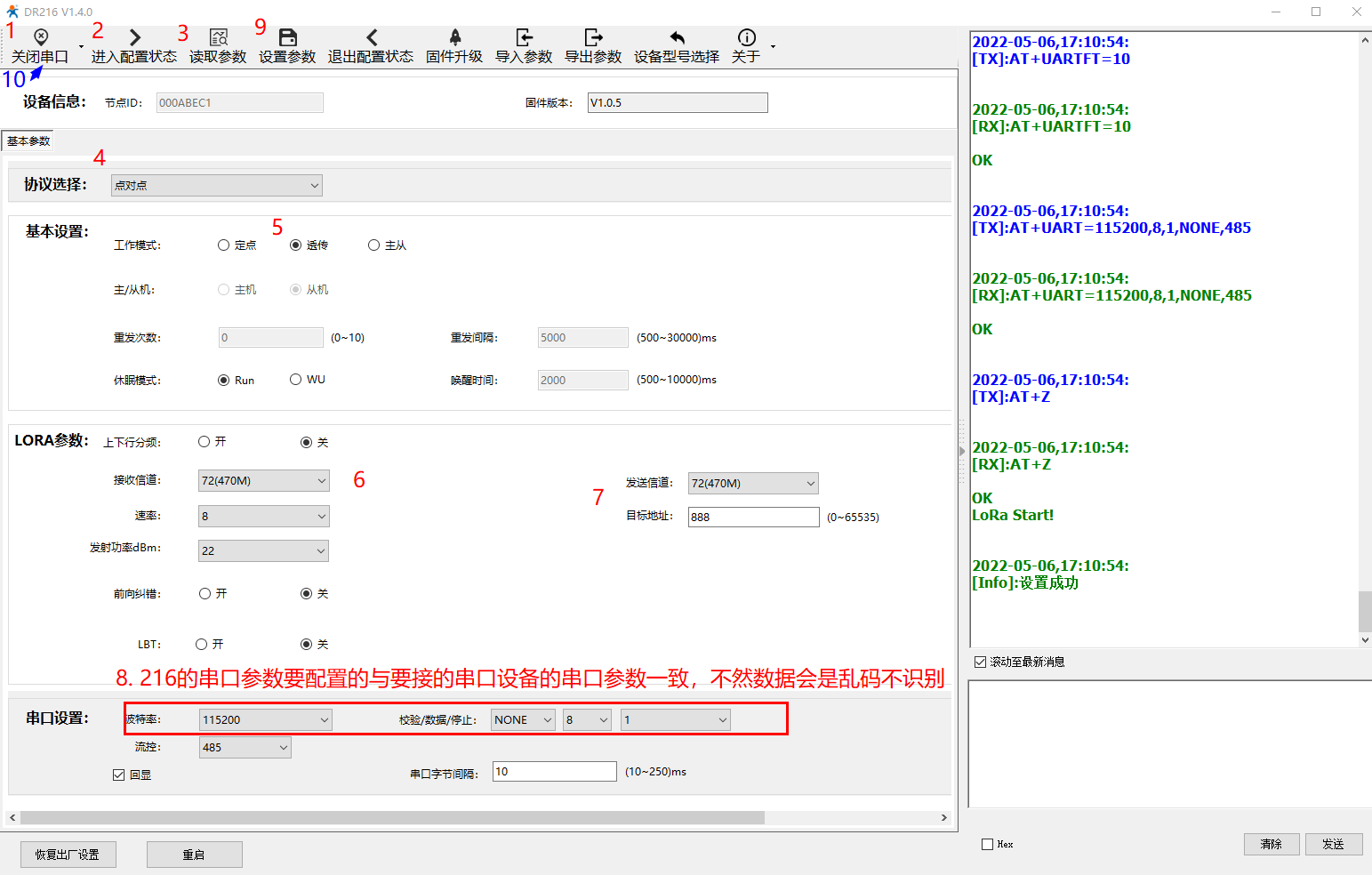 點擊打開串口(選擇A、B對應的串口號,DR216默認串口參數:115200,None,8,1,NFC)、進入配置狀態、讀取參數、配置速率等級8,信道72,目標地址888, 串口設置中的參數配置為您實際要連接的串口設備的串口參數, 點擊設置所有參數,關閉串口。