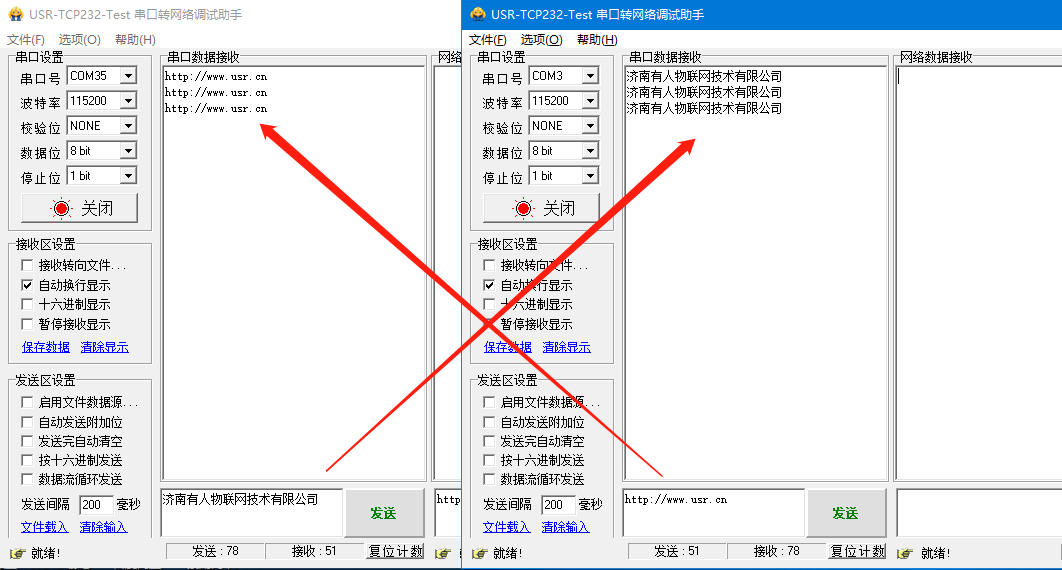 (3)啟動兩個USR-TCP232-Test(模擬串口設備1,2)分別連接LoRa數傳終端A、B的串口,使用串口設備1發送數據串口設備2可接收數據(反之亦然),通信效果如下圖所示: