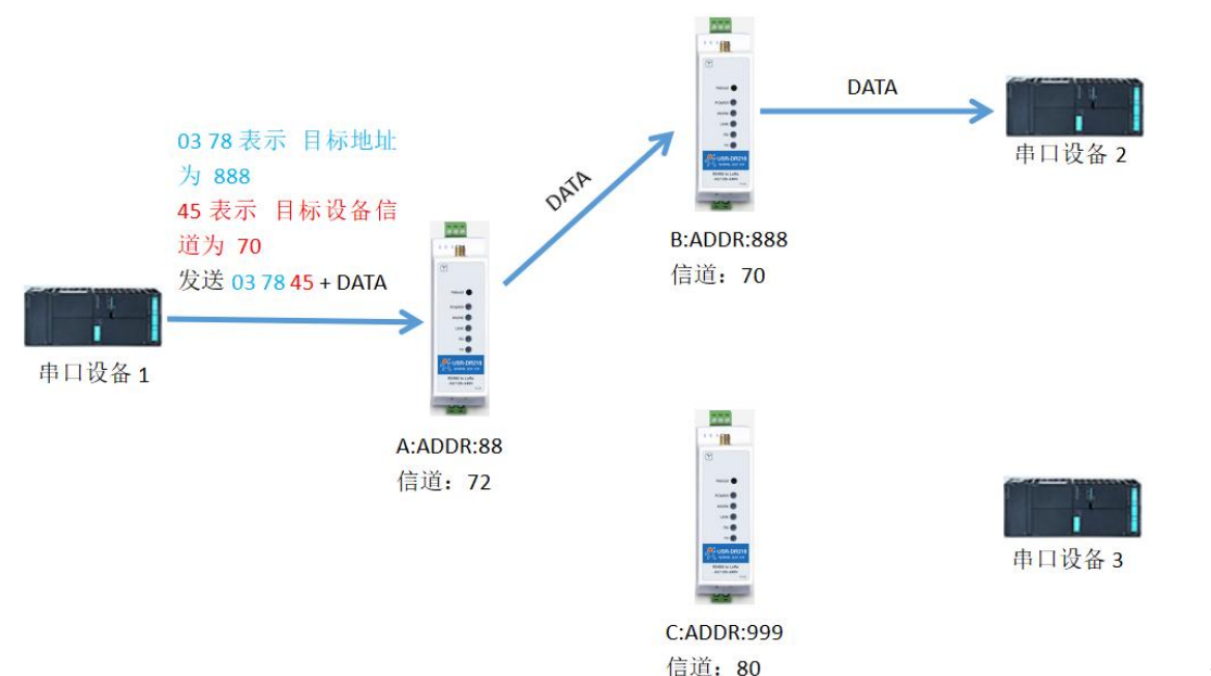 LoRa 數傳終端 A(目標地址(ADDR):88,信道(CH):72)想向另一臺 LoRa 數傳終端 B(目標地址 (ADDR):888,信道(CH):70)發(fā)送數據 DATA(123456),則只需要按照 16 進制發(fā)送(03 78 46 31 32 33 34 35 36),則 LoRa 數傳終端 B 接收到數據(31 32 33 34 35 36)。