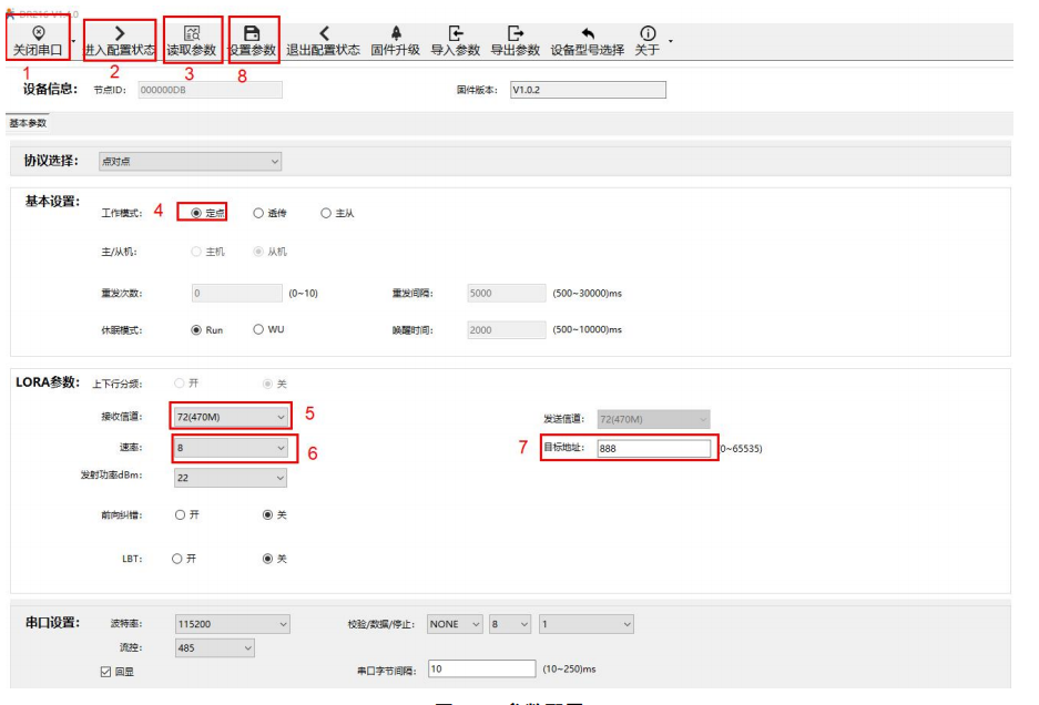打開LoRa設置軟件→ 選擇DR216 → 依次點擊打開串口(選擇A對應的串口號,串口參數:115200,None,8,1,NFC) → 進入配置狀態(tài) → 讀取參數 → 配置參數 (設備A:定點模式,速率8,信道72,目標地址88)→ 設置所有參數 → 關閉串口。