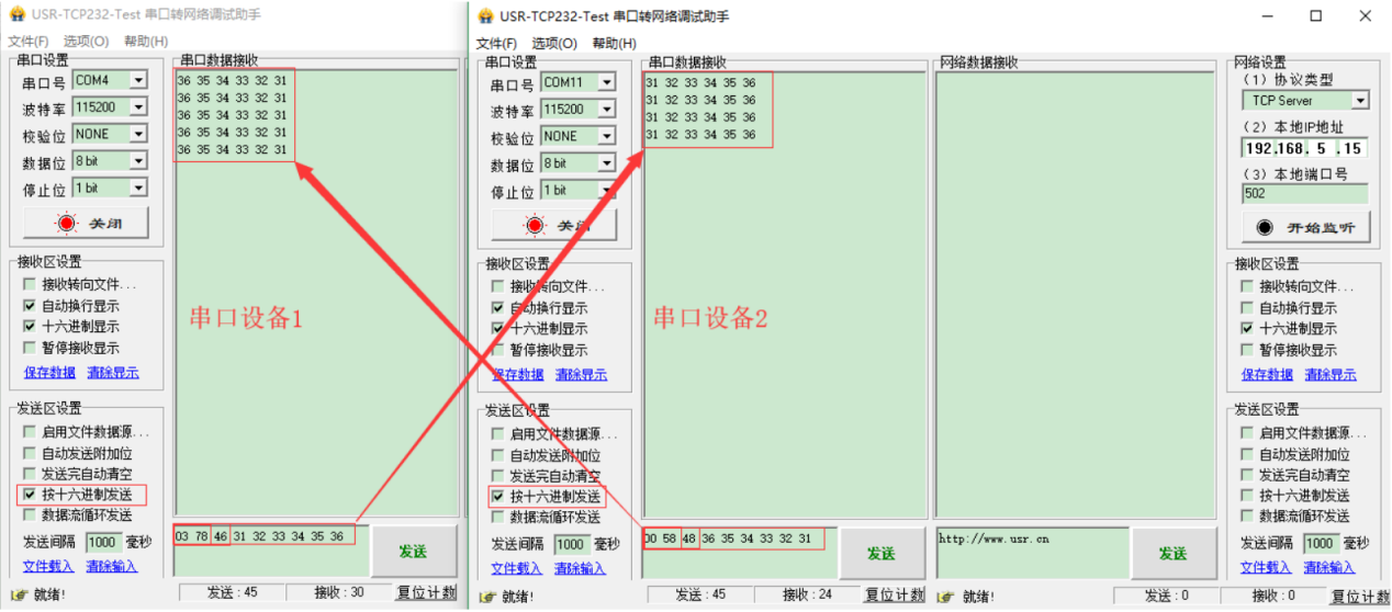 啟動兩個USR-TCP232-Test(模擬串口設備1,2)分別連接LoRa數傳終端A、B的串口,使用串口設備1發(fā)送數據串口設備2可接收數據(反之亦然)。