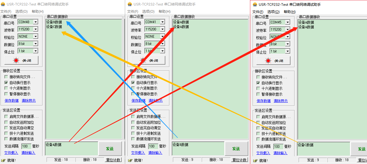 啟動(dòng)三個(gè)USR-TCP232-Test(模擬串口設(shè)備A,B,C)分別連接LoRa數(shù)傳廣播端A、接收端B、C的串口,使用串口設(shè)備1發(fā)送數(shù)據(jù),串口設(shè)備2、3可接收數(shù)據(jù),設(shè)備2、3的數(shù)據(jù)可以發(fā)送給設(shè)備1,通信效果如下圖所示: