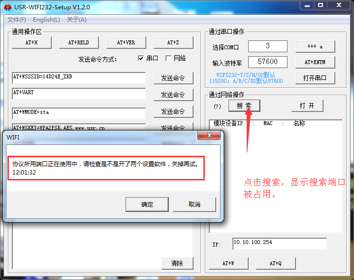 1:WiFi232-Setup軟件,點(diǎn)擊搜索時(shí),顯示端口被占用。
