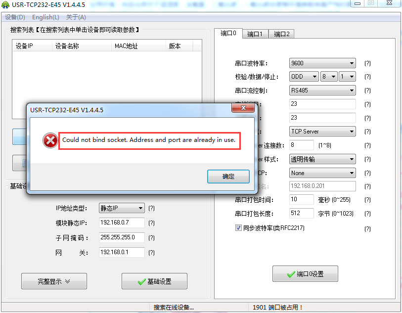 2:TCP232-E45設(shè)置軟件搜索之后的顯示,端口被占用。