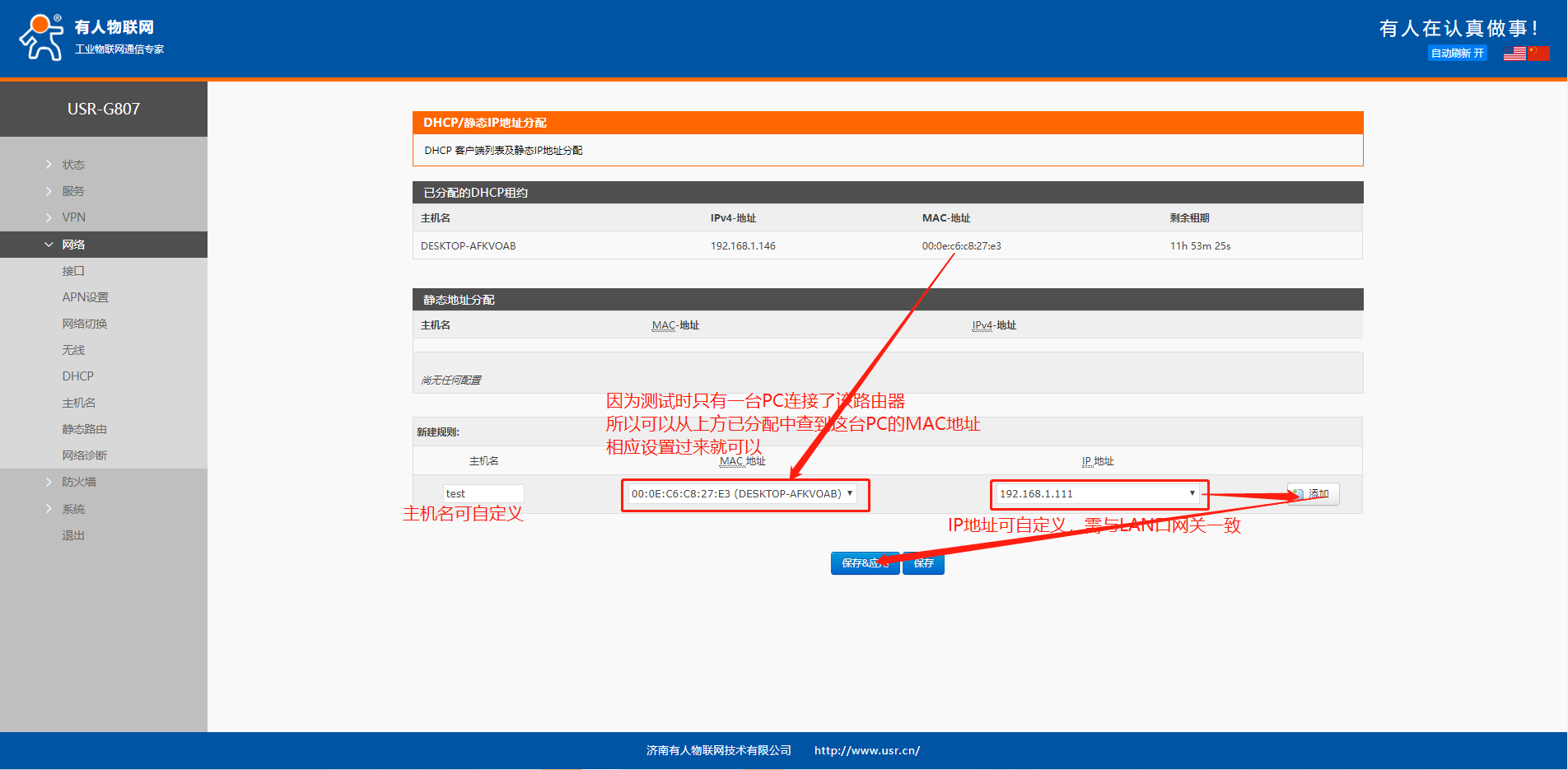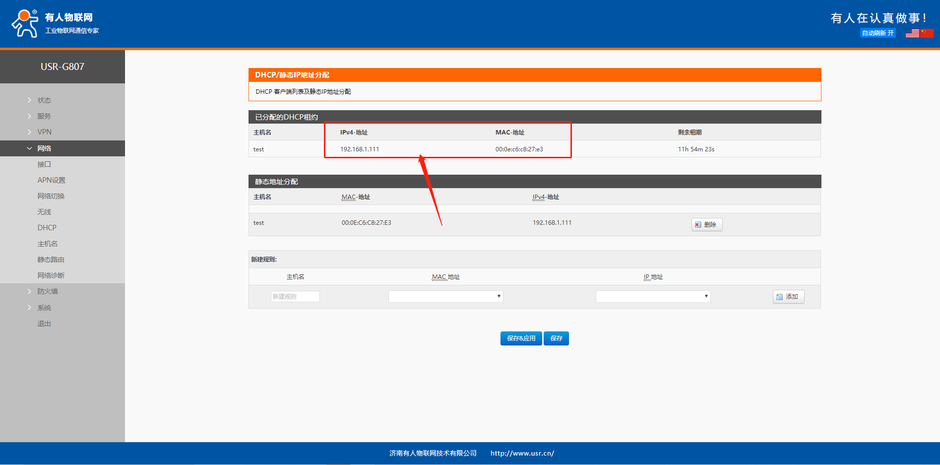 然后點擊保存并應用(若不知道設備MAC,且之前設備是DHCP接入G807,可以在該界面上已分配的DHCP租約看到設備的接入信息)