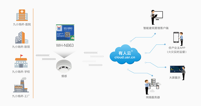 NB63支持低功耗工作模式,待機時間長,可全天候提供數據傳輸;NB-IoT可連接的終端數量多,滿足海量煙感器同時接入;同時,NB-IoT適合狹小、逼仄場景安裝使用,信號穿透強,免布線安裝,節省項目開支