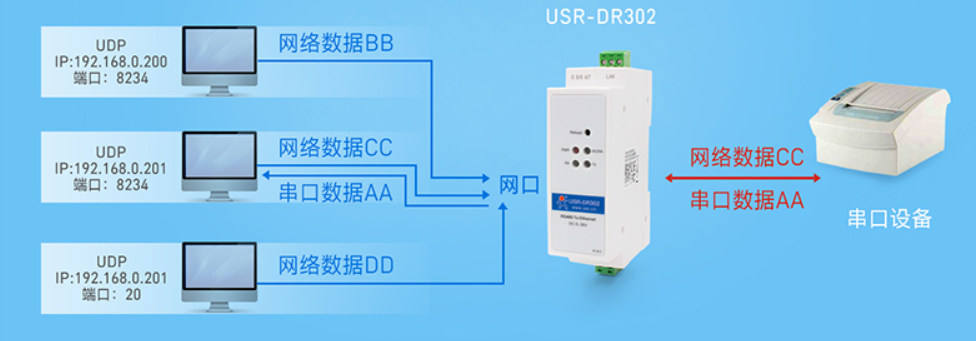 (2)DR302做udp server,將接收到的數據自動發送至上一次通訊的網絡目標,適合多網絡設備均需與DR302通信的傳輸場景使用。