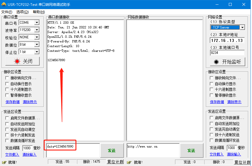 打開串口網絡助手,串口參數和N540 端口1參數保持一致,串口發送數據data=1234567890,測試服務器返回數據。