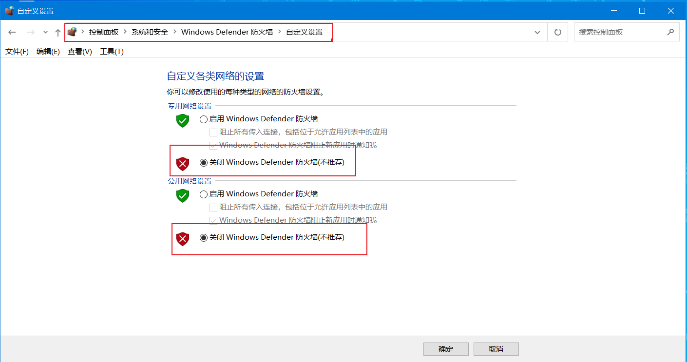 2.按路徑:控制面板》網絡和Internet》網絡和共享中心找到“windows防火墻”和“更改適配器設置”選項,關閉防火墻并禁用與本次測試無關的網卡。并關閉電腦殺毒軟件。