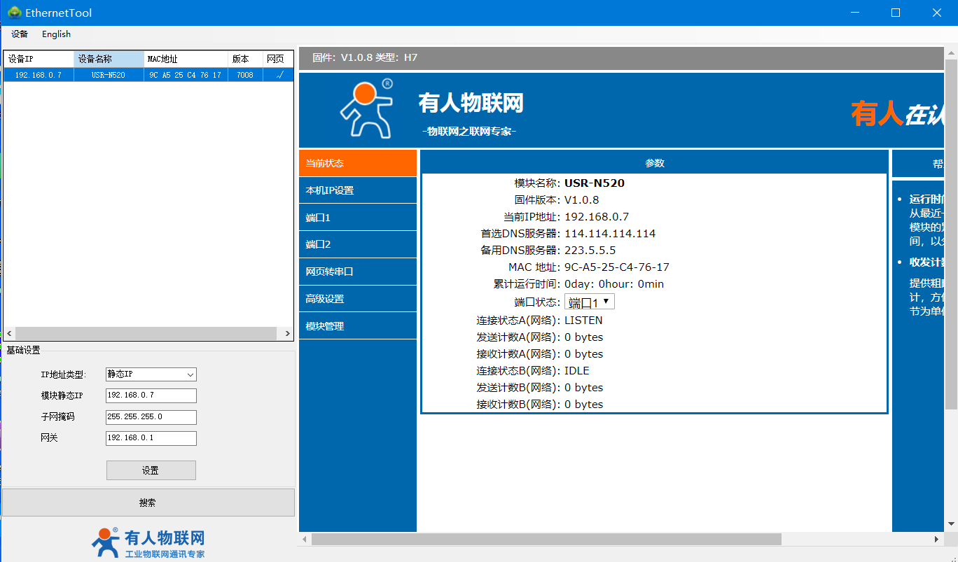 1.N520(USR-N520,簡稱 N520 下同)通過串口線(或USB 轉RS232串口線)將RS232接口與計算機相連接,通過網線將 N520的網口 與PC 的網口相連接,檢測硬件連接無錯誤后,接入5V電源適配器,給其供電。觀察N520電源指示燈及工作指示燈狀態是否正常:紅燈常亮,綠燈閃爍。網口指示燈狀態是否正常:網口綠色燈常亮,黃色燈閃爍。