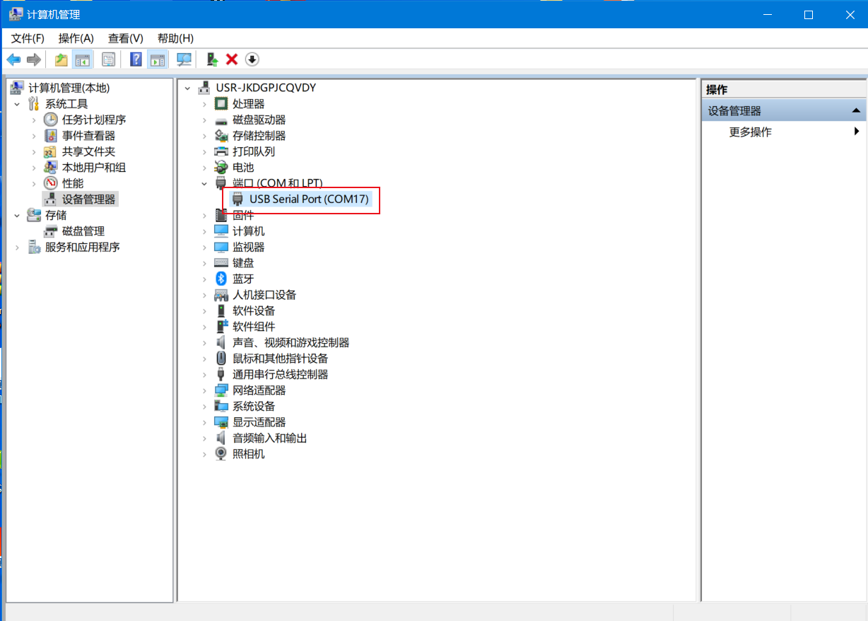 5.在設備管理器中查看端口信息,確定520串口使用的串口號,如下圖所示電腦端口號為COM17。