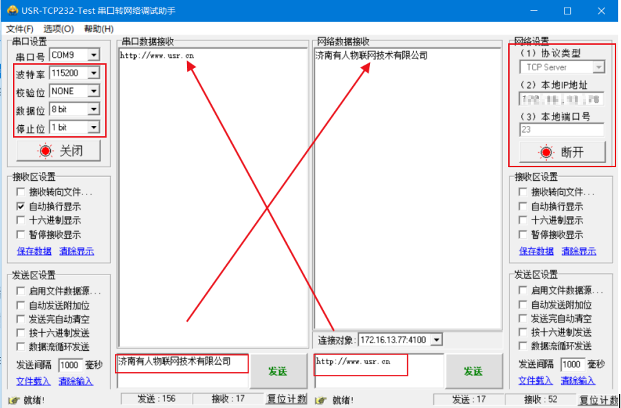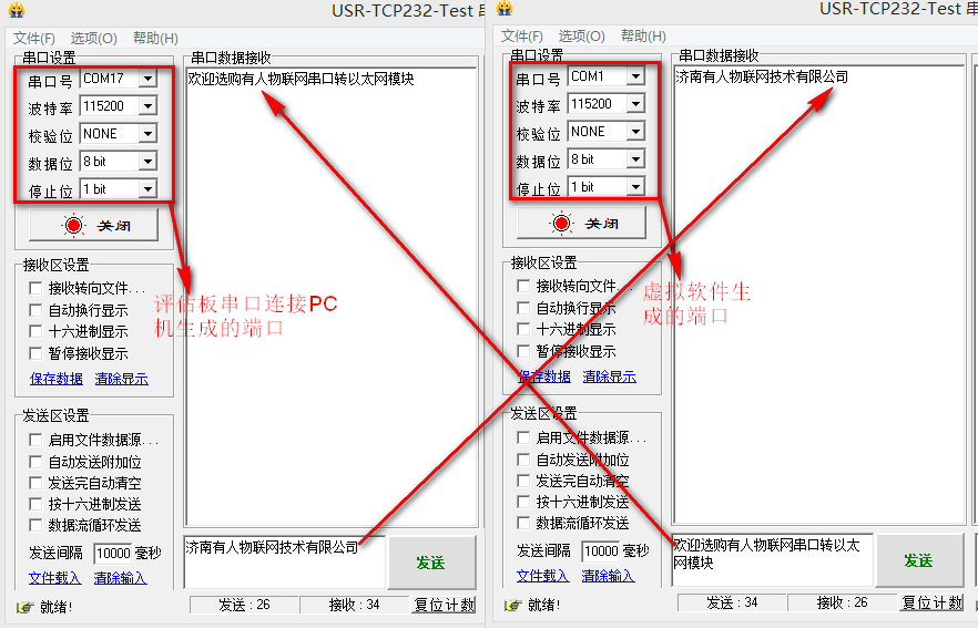 打開兩個USR_TCP232_Test軟件,一個連接COM17,一個連接虛擬串口COM1,實現兩個串口直接數據互發。