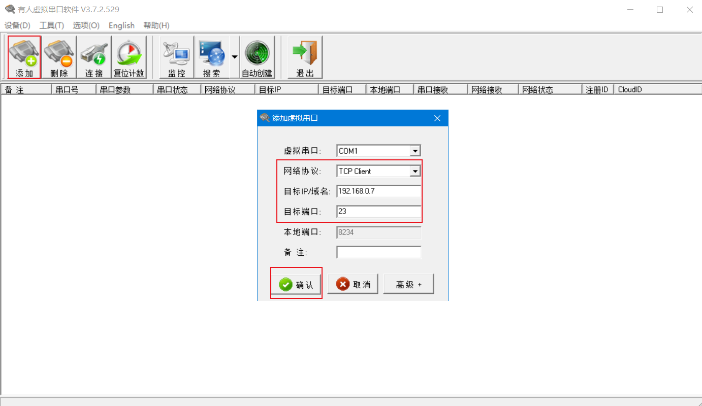 打開虛擬串口軟件,點擊“添加”在彈出的窗口中設置虛擬串口信息,由于上述N520設備采用TCP SERVER協議,所以此處網絡協議設置為TCP CLIENT。目標IP設置為N520的IP:192.168.0.7 目標端口號為N520 端口1的本地端口號:23,然后點擊“確定”,建立虛擬串口COM1。