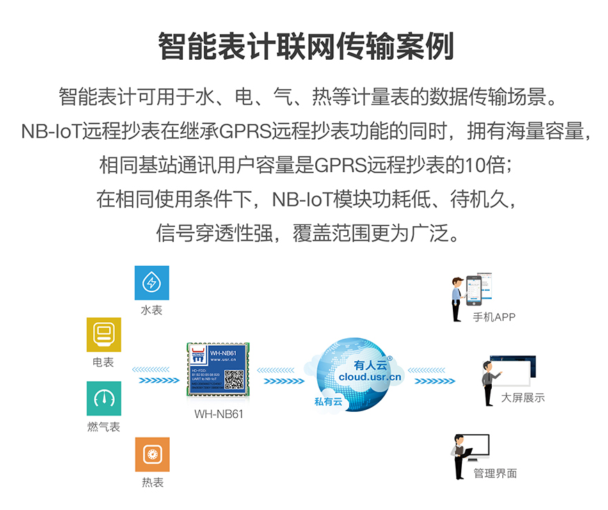 智能表計可用于水、電、氣、熱等計量表的數據傳輸場景。NB-IOT遠程抄表在繼承GPRS遠程抄表功能的同時,擁有海量容量,相同基站通訊用戶容量是GPRS遠程抄表的10倍;在相同使用條件下,NB-IOT模塊功耗低、待機久。信號穿透性強,覆蓋范圍更為廣泛