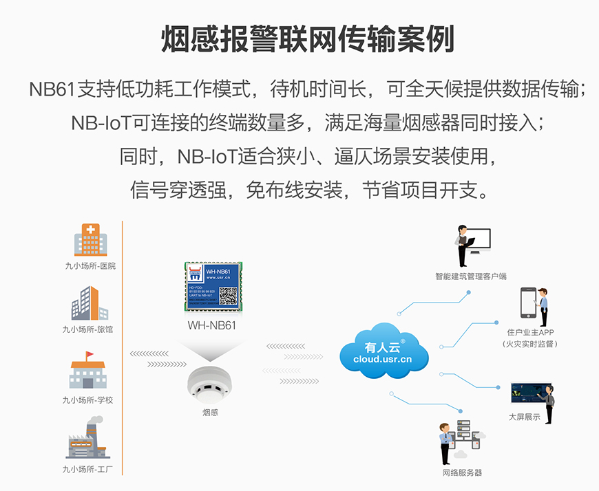 NB61支持低功耗工作模式,待機時間長,可全天候提供數據傳輸;NB-IOT可連接的終端數量多,滿足海量煙感器同時接入;同時NB-IOT適合狹小、逼仄場景安裝使用,信號穿透強,免布線安裝,節省項目開支