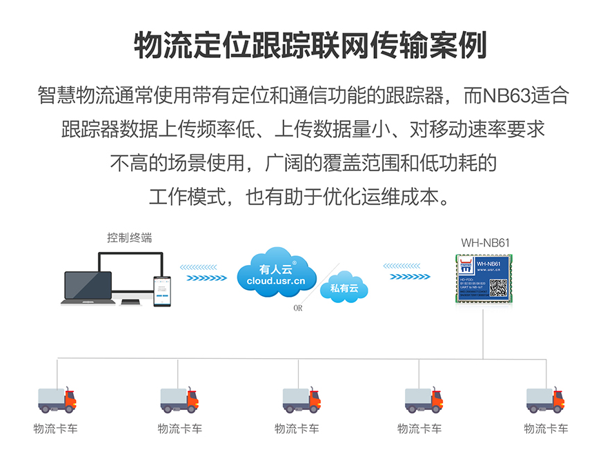 智慧物流通常使用帶有定位和通信功能的跟蹤器,而NB61適合跟蹤器數據上傳頻率低、上傳數據量小、對移動速率要求不高的場景使用,廣闊的覆蓋范圍和低功耗的工作模式,也有助于優化運維成本