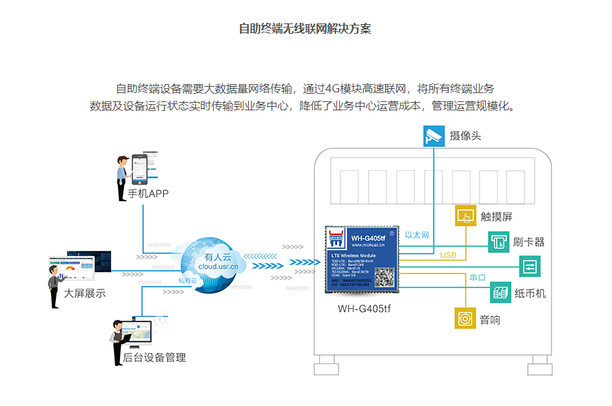 自助終端設備需要大數據量網絡傳輸,通過4G模塊高速聯網,將所有終端業務數據及設備運行狀態實時傳輸到業務中心,降低了業務中心運營成本,管理運營規?;?/span>