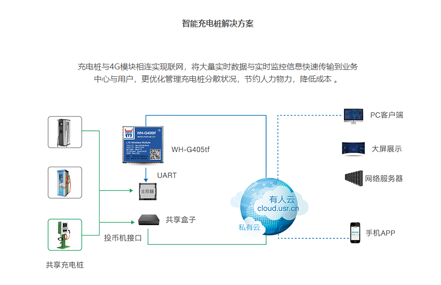 充電樁與4G模塊相連實現聯網,將大量實時數據與實時監控信息快速傳輸到業務
