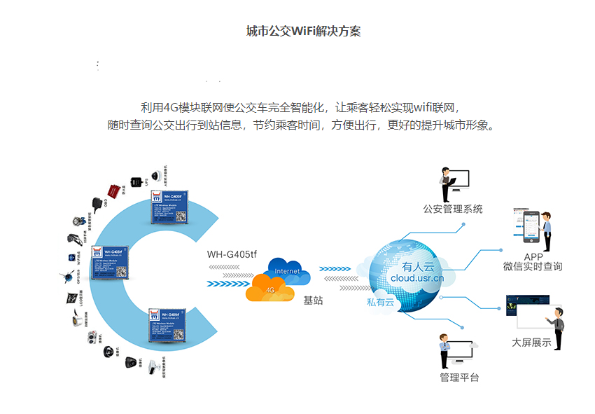 利用4G模塊聯網使公交車完全智能化,讓乘客輕松實現wifi聯網,隨時查詢公交出行到站信息,節約乘客時間,方便出行,更好的提升城市形象