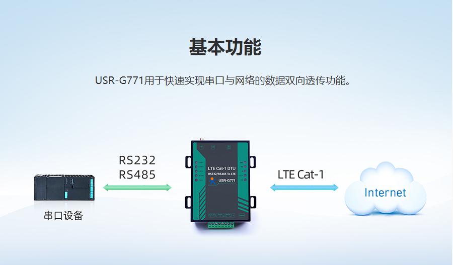 (3)數據透傳功能,即設備串口收到的數據原封不動傳至服務器輸出,例如串口終端設備向G771發送數據“123”,通過G771傳輸至服務器的數據即為“123”;反之服務器下發至串口亦為數據透明傳輸