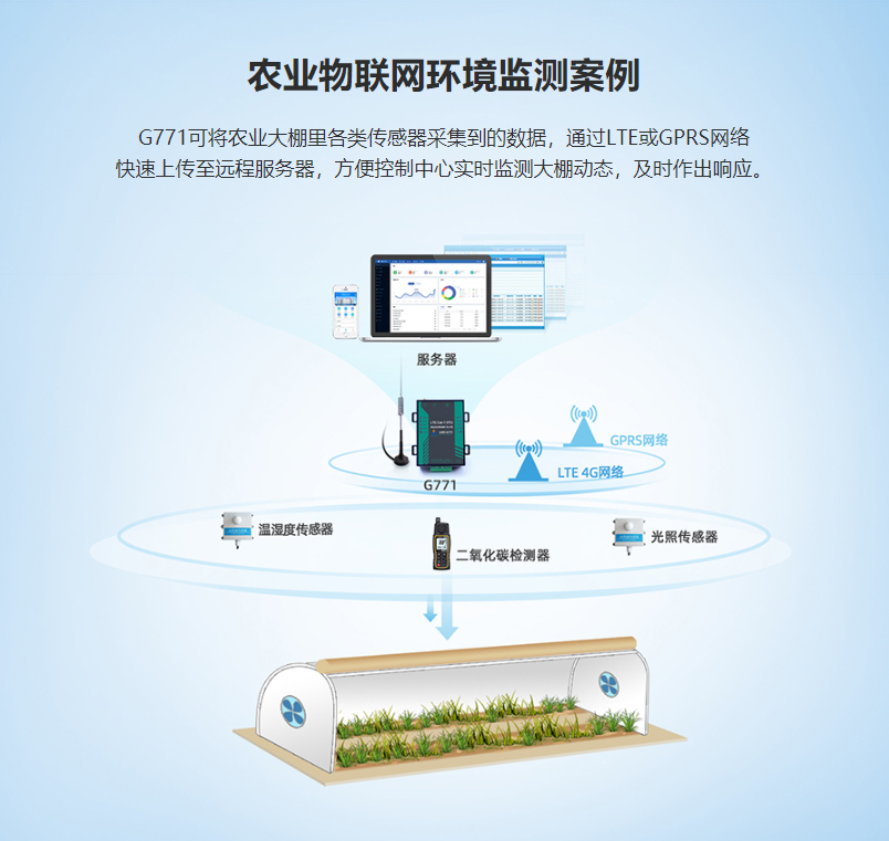 G771可將農業大棚里各類傳感器采集到的數據,通過LTE或GPRS網絡快速上傳至遠程服務器,方便控制中心實時監測大棚動態,及時作出相應