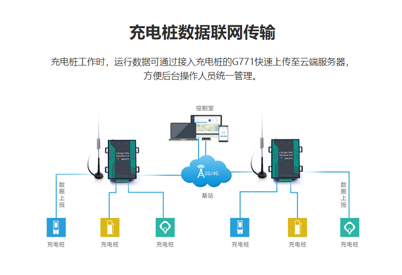 充電樁工作時,運行數據可通過接入充電樁的G771快速上傳至云端服務器,方便后臺操作人員統一管理