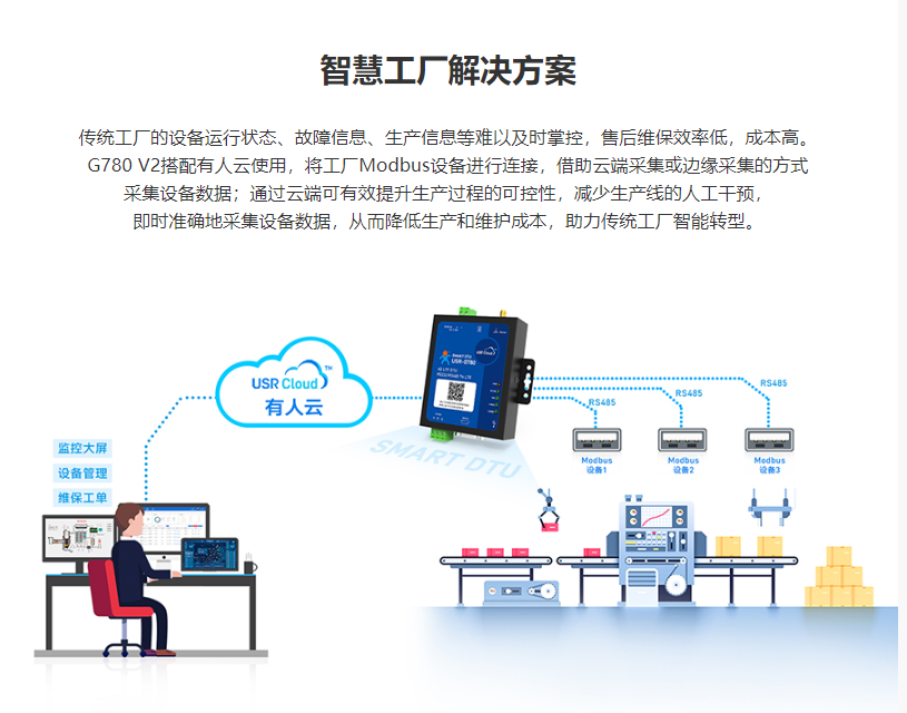 G780 V2搭配有人云使用,將工廠Modbus設備進行連接,借助云端采集或邊緣采集的方式采集設備數據;通過云端可有效提升生產過程的可控性,減少生產線的人工干預,即時準確的采集設備數據,從而降低生產和維護成本,助力傳統工廠智能轉型