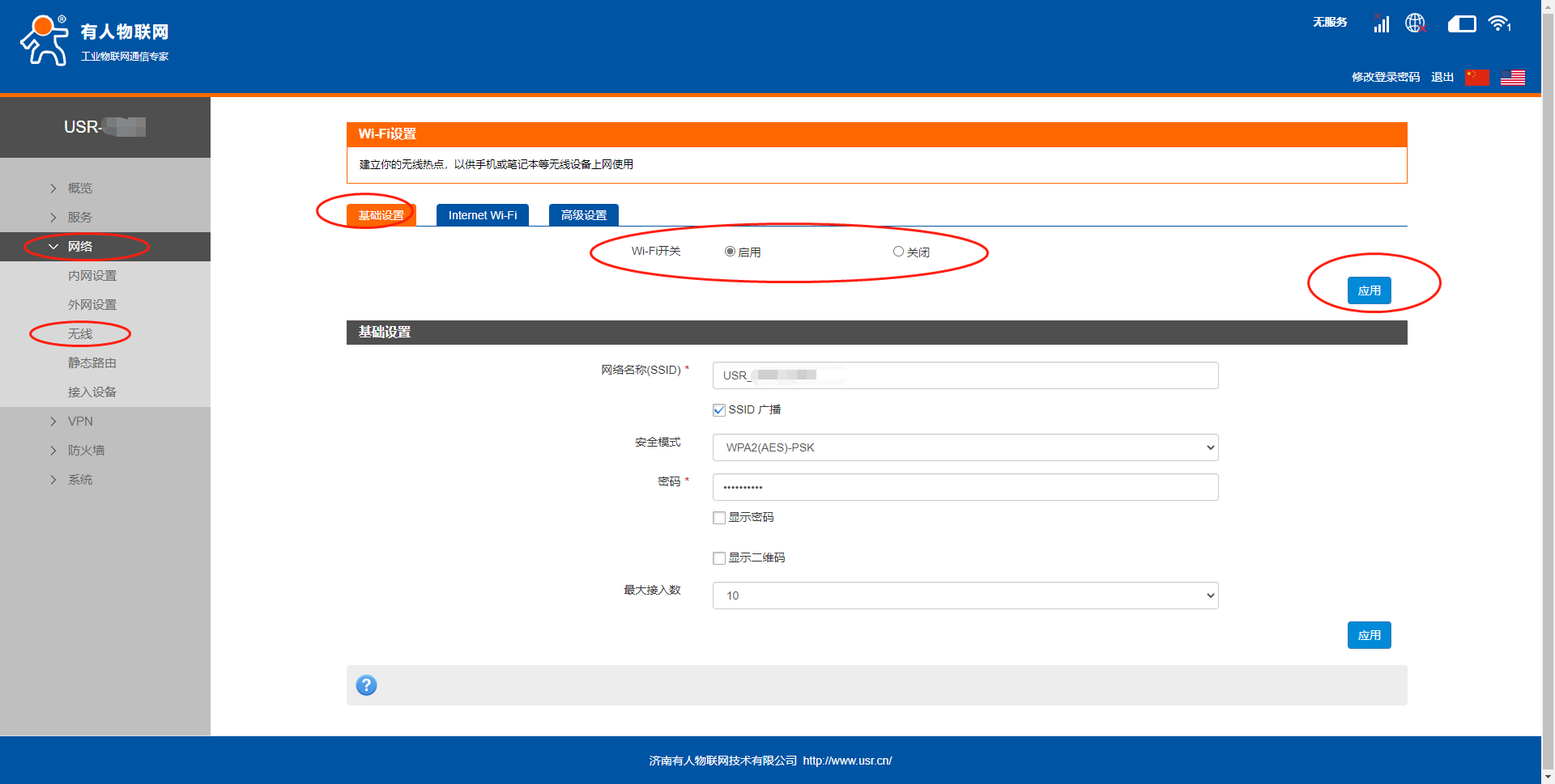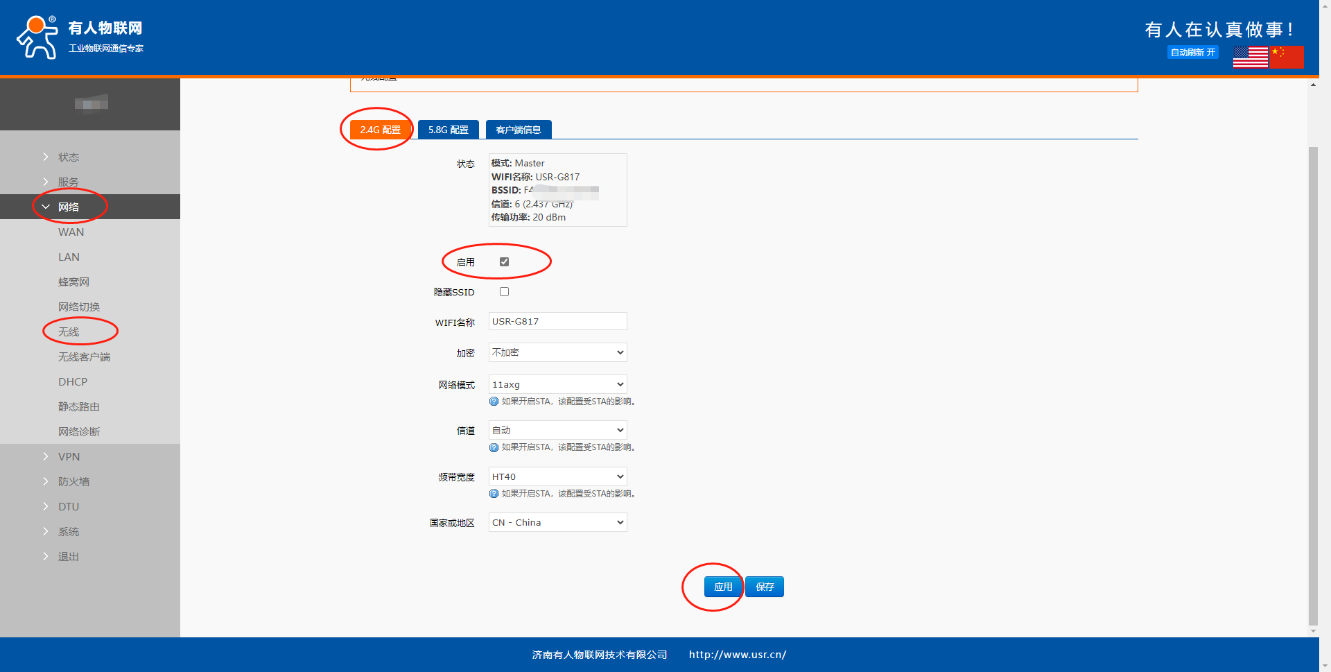 G805(包括RM02、RM03)系列:網絡--無線--基礎設置--WIFI開關--應用